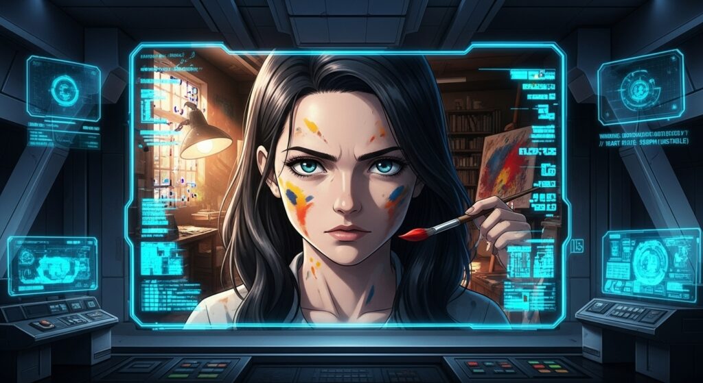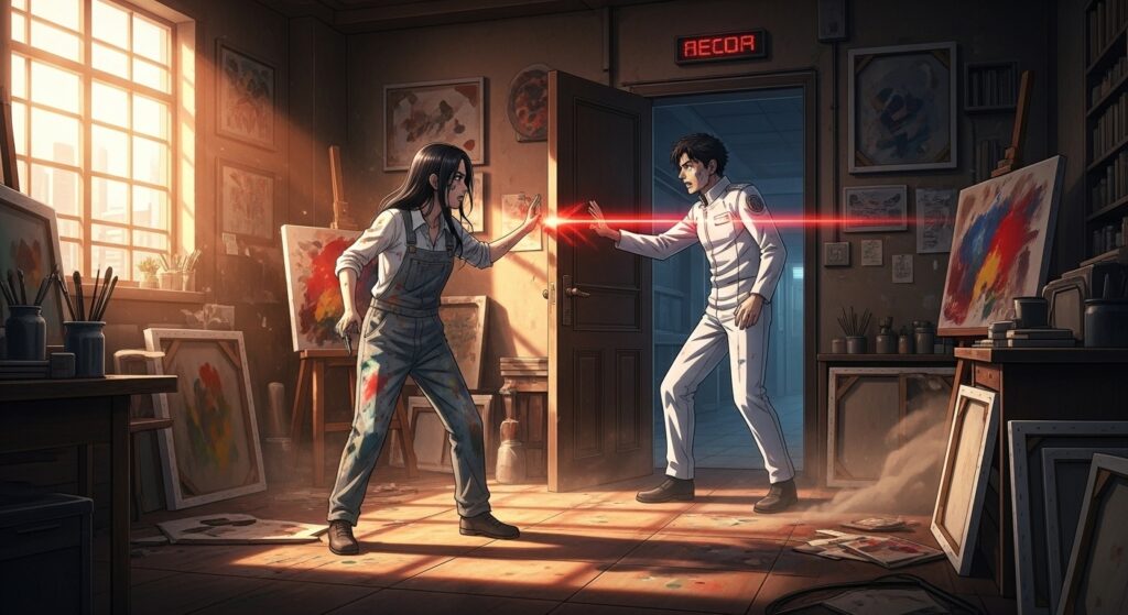 カイの任務は、ステルスドローンによる24時間監視。リノのアトリエは、埃っぽいアナログ機材と、禁止されているはずの強烈な色彩で溢れていた。彼女は、都市が「精神汚染のリスク」として排除した「絵画」を復元していた。