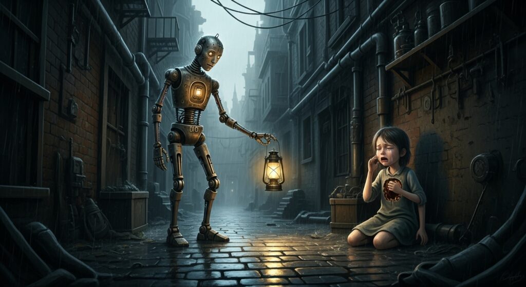 鉛色の雲は、まだ街の上空に居座っている。彼の心臓の錆が、完全に消えたわけでもない。 だが、彼はもう一人ではなかった。守るべき”可愛い灯”がすぐそばにある。それだけで、世界は昨日までとは全く違って見えた。